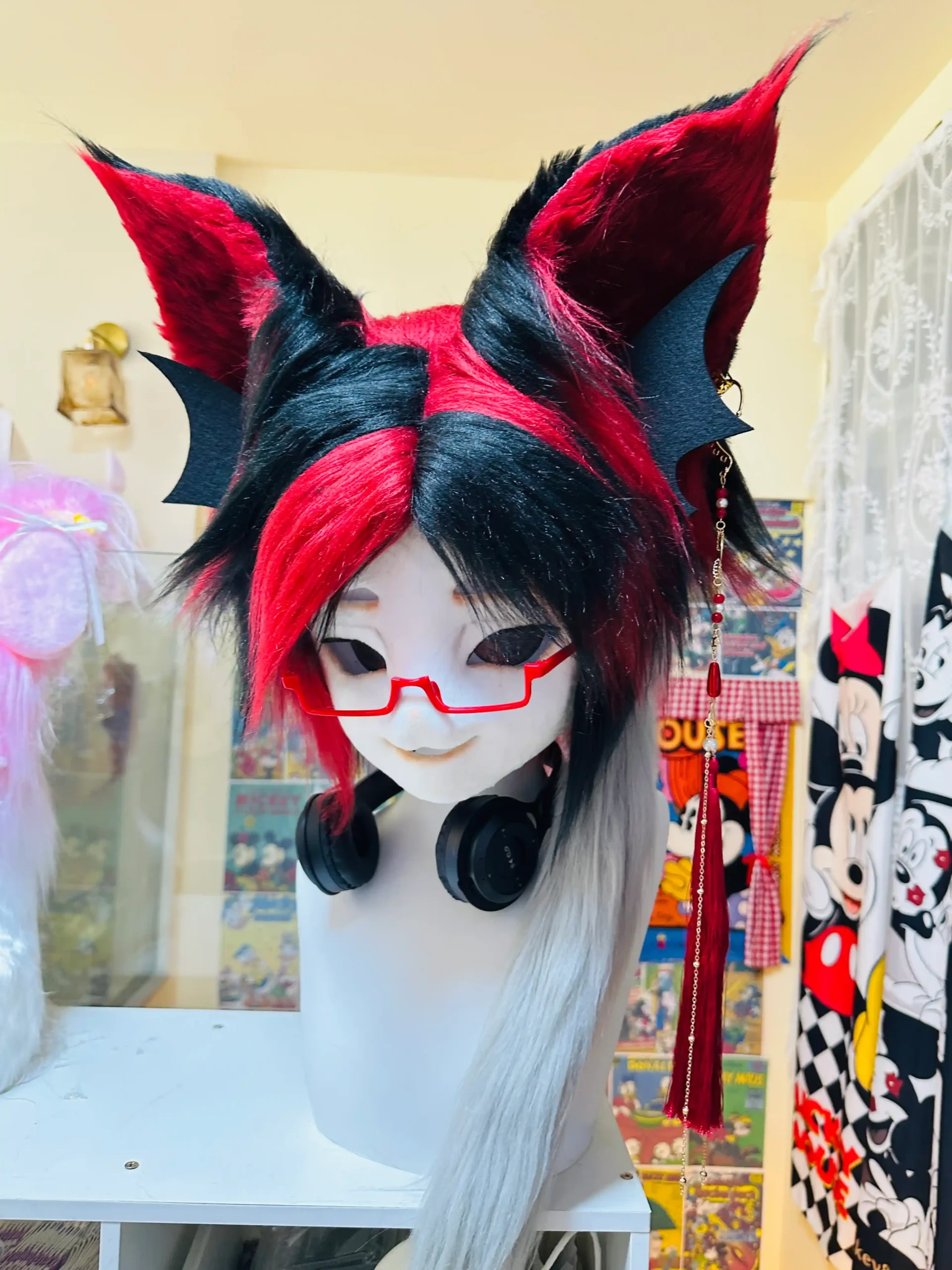 A cyber-inspired kemono fursuit head combining bold red and black tones with a sharp, modern street aesthetic.