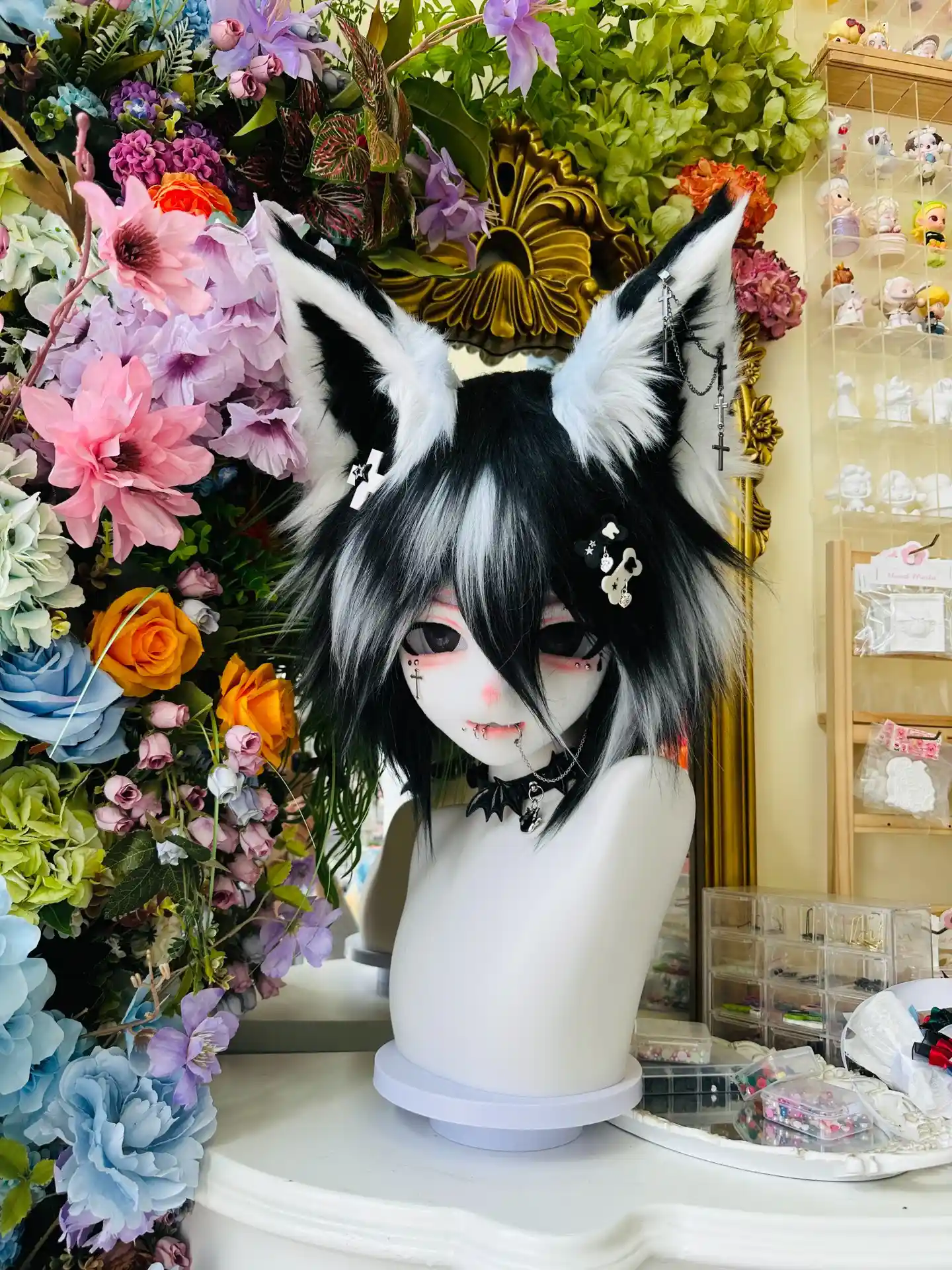This gothic kemono fursuit head is built around a stark black-and-white palette, combining soft fur textures with sharp visual accents.