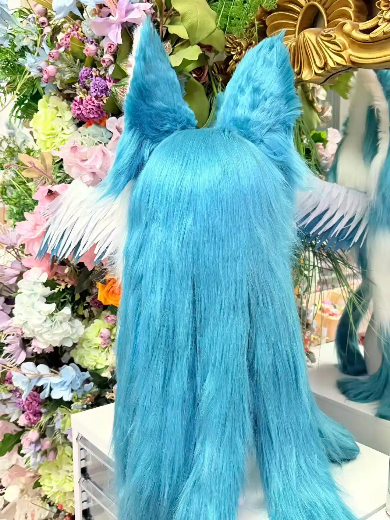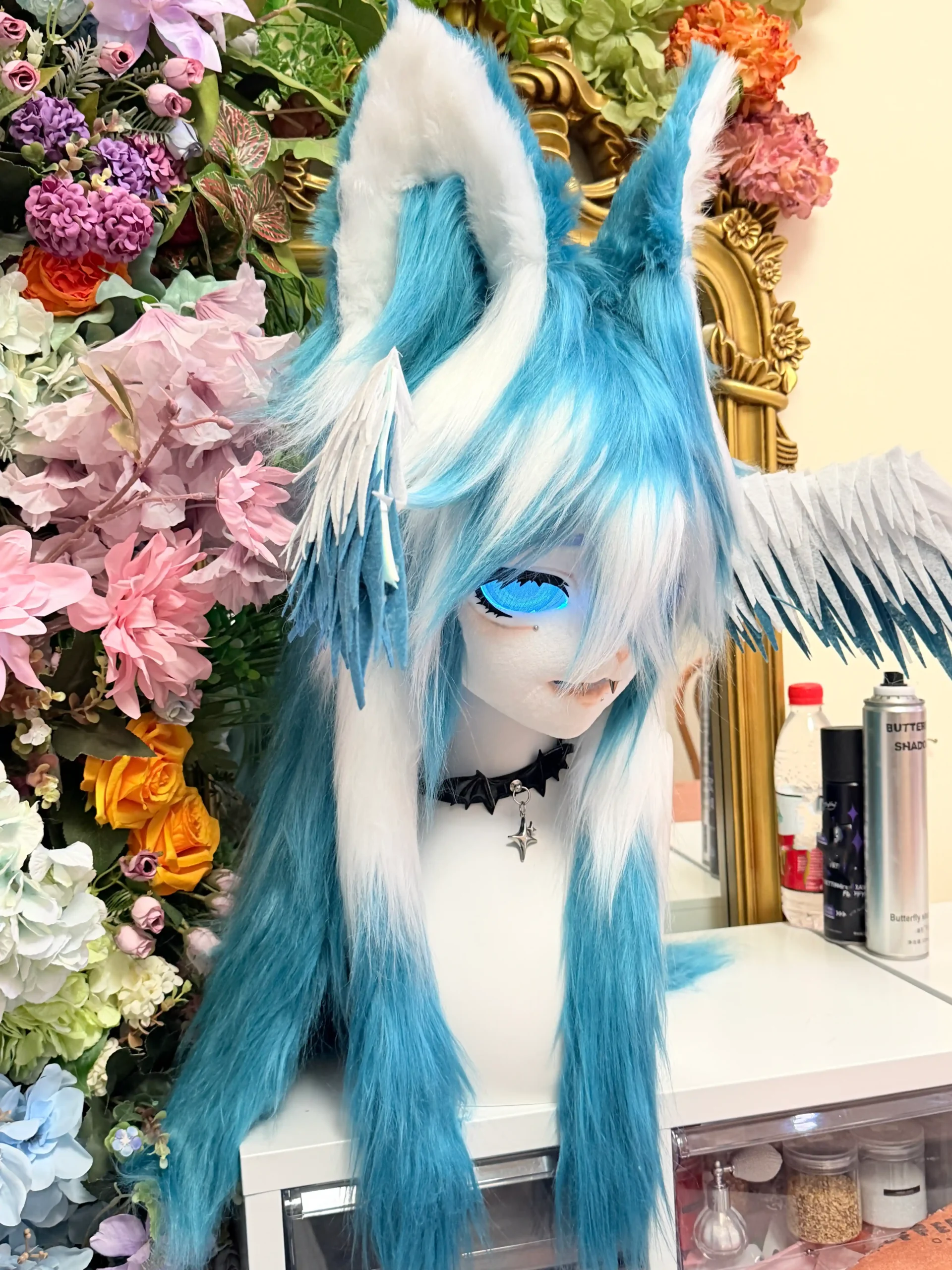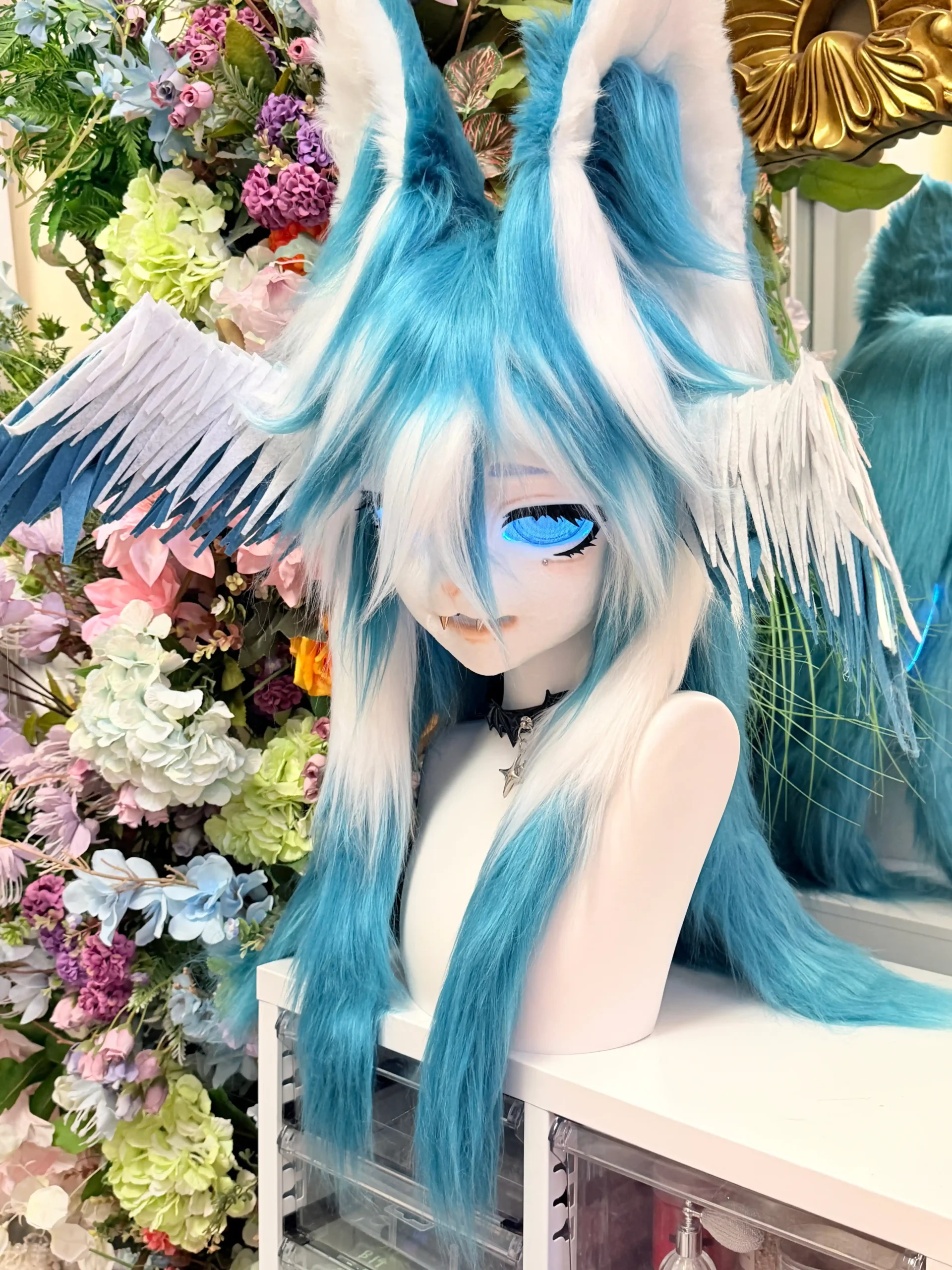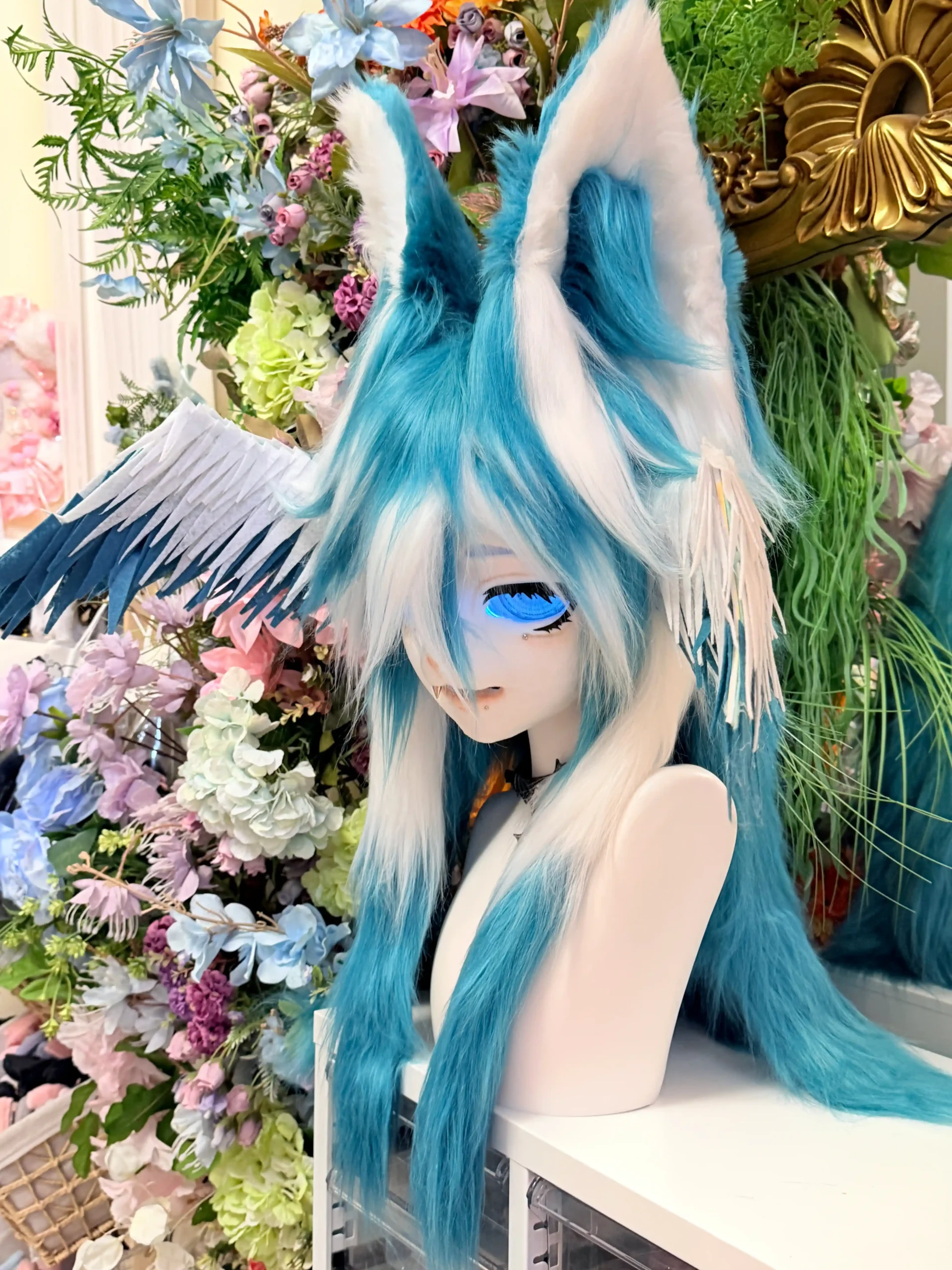 This kemono fursuit head is designed as a one-off fantasy piece, inspired by icy wings and quiet, dreamlike imagery.