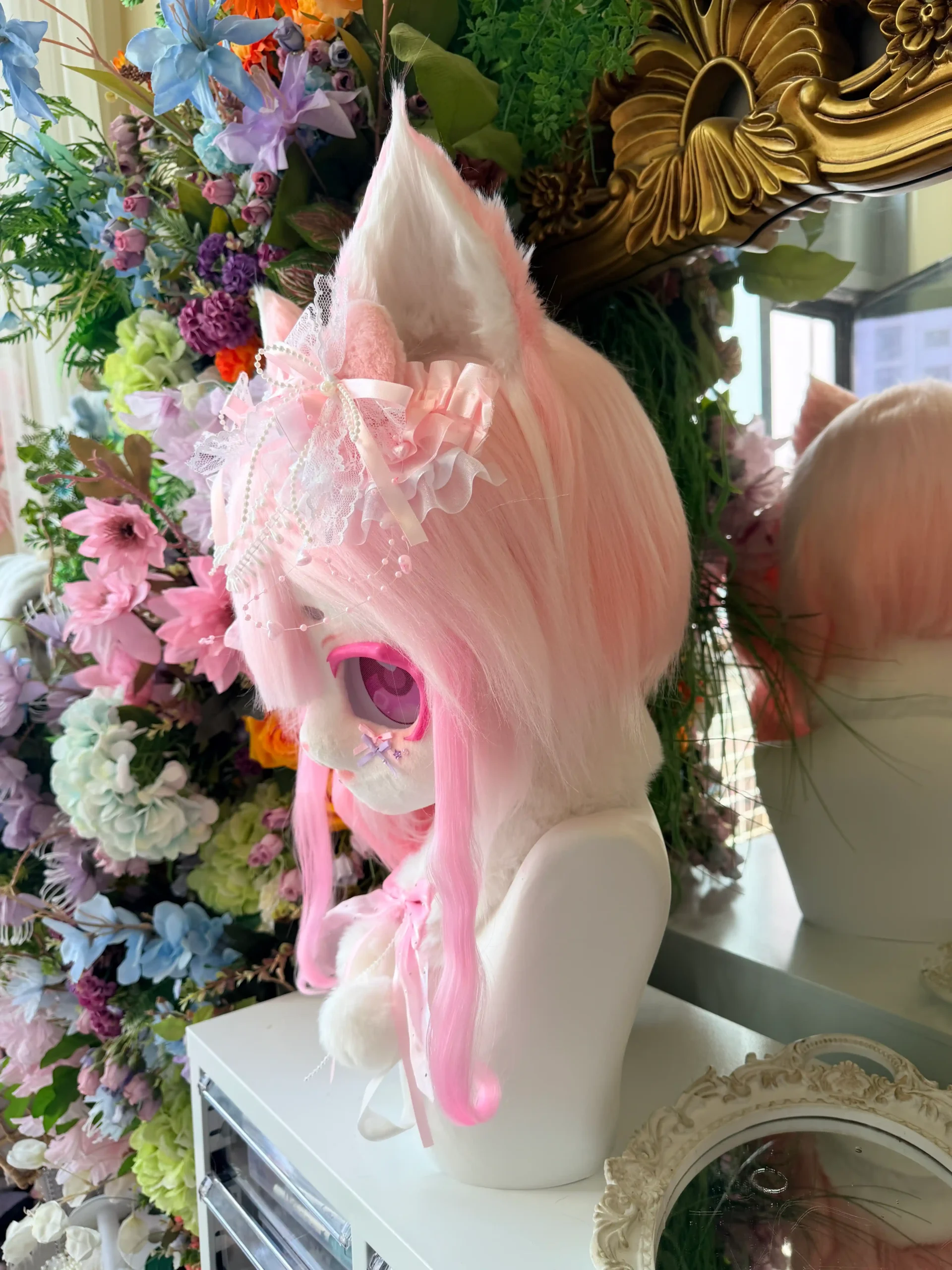 A soft, romantic kemono fursuit head featuring blush pink tones, lace details, and a gentle, doll-like expression.