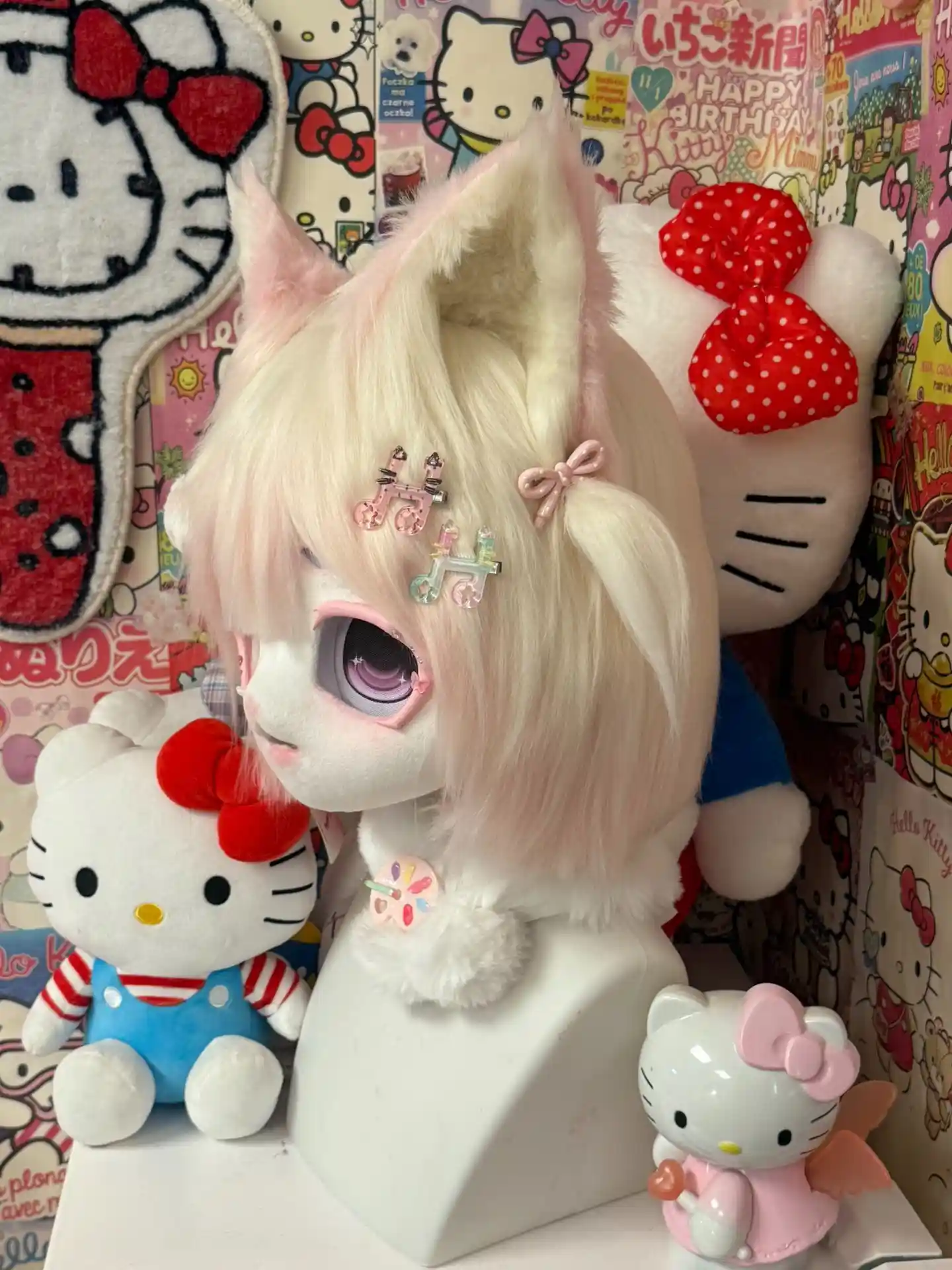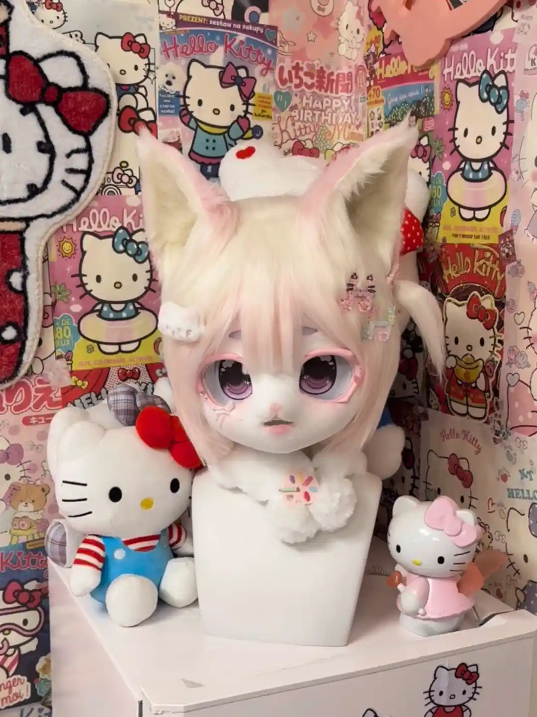 This kawaii kemono fursuit head is designed around a soft, doll-inspired aesthetic, combining warm pink hues with clean white fur for a gentle and comforting appearance.