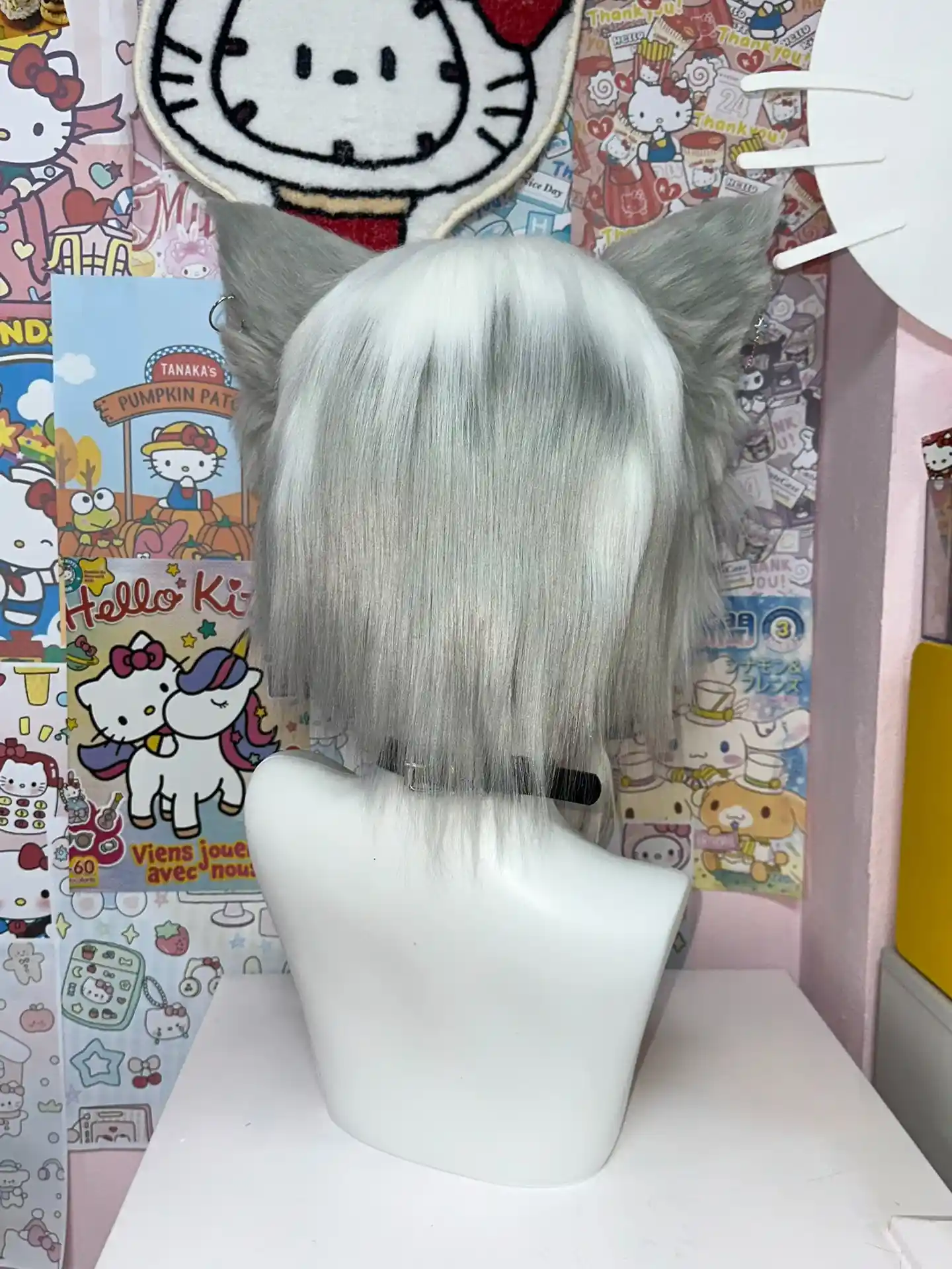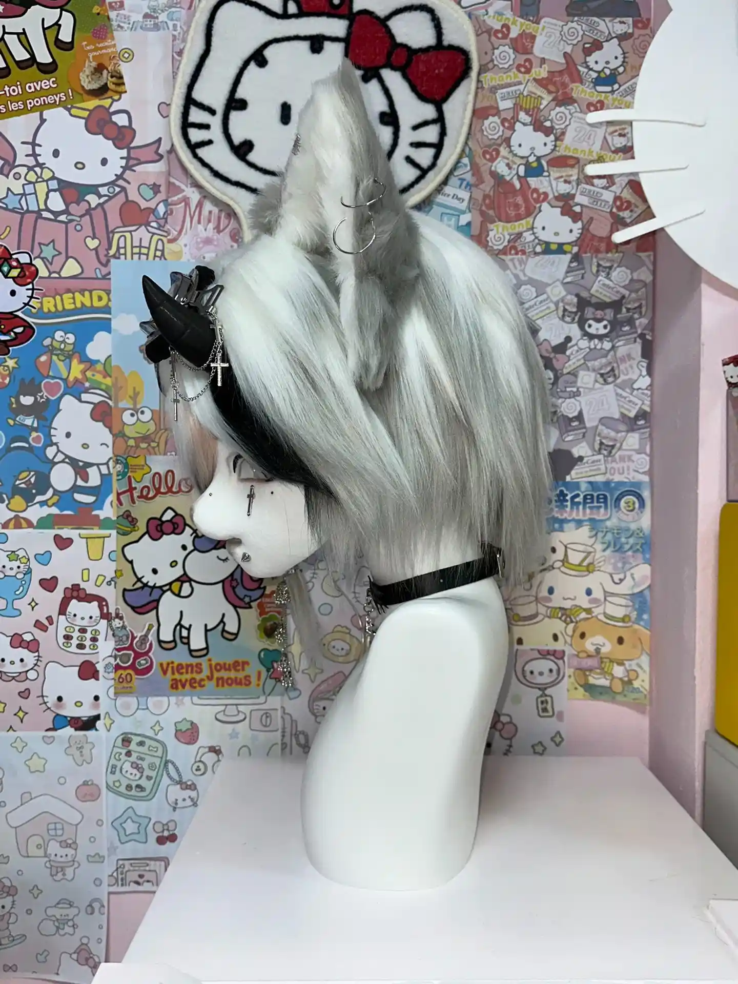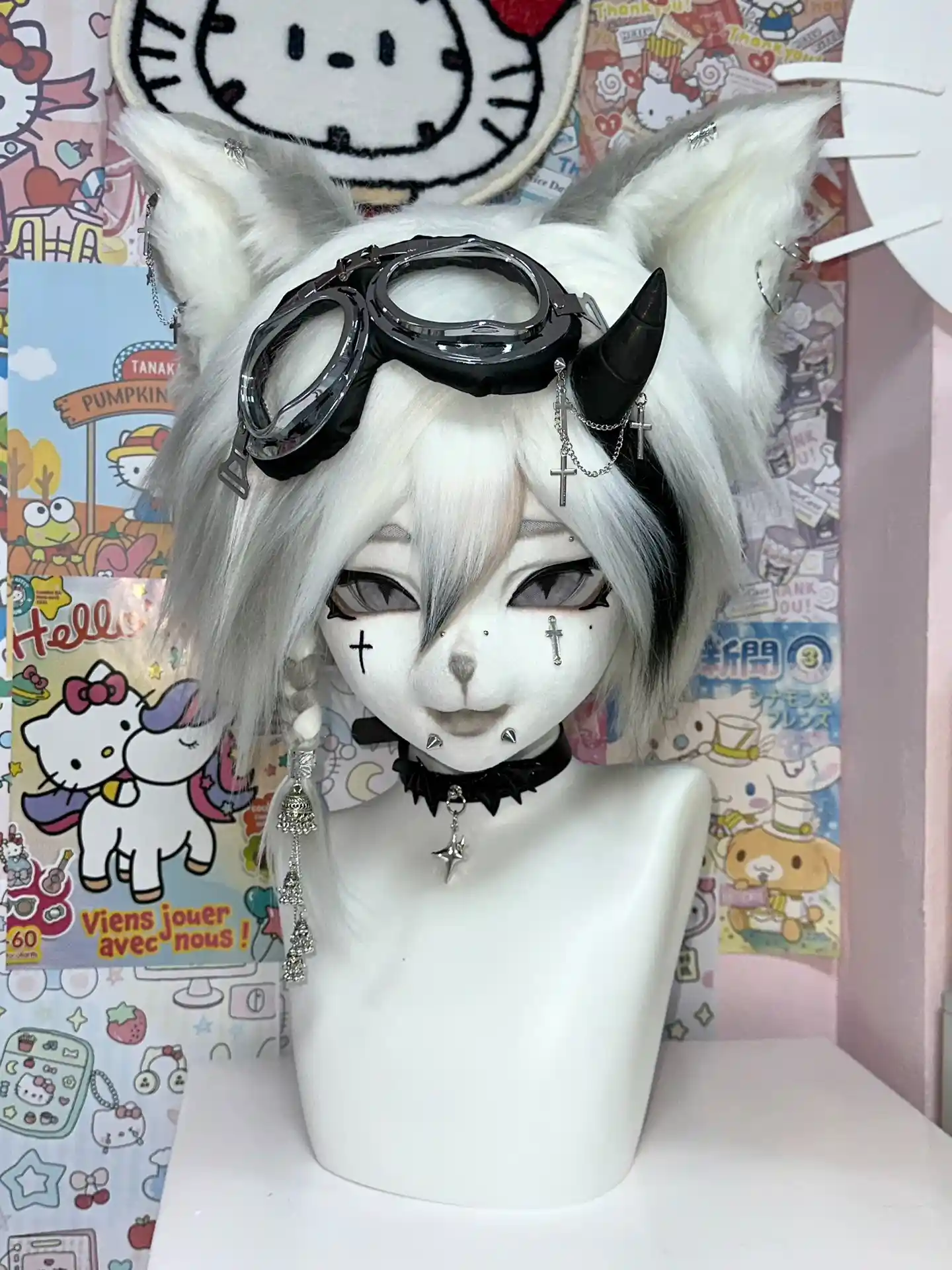 The contrast between soft white fur and deep black accents creates a striking visual balance, while the goggles and metal accessories add a rebellious, dystopian edge.